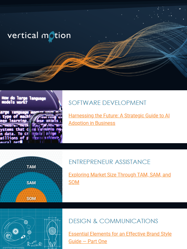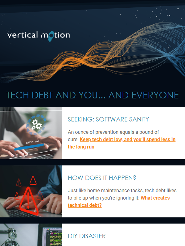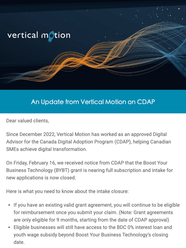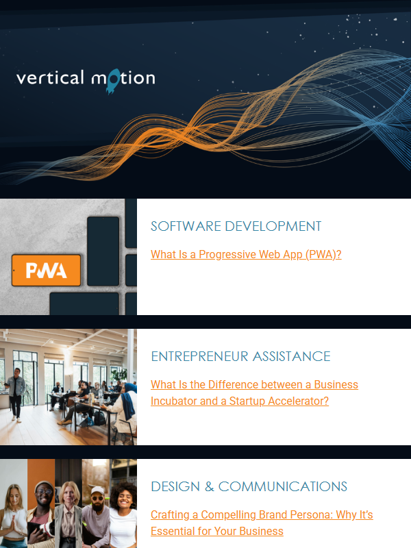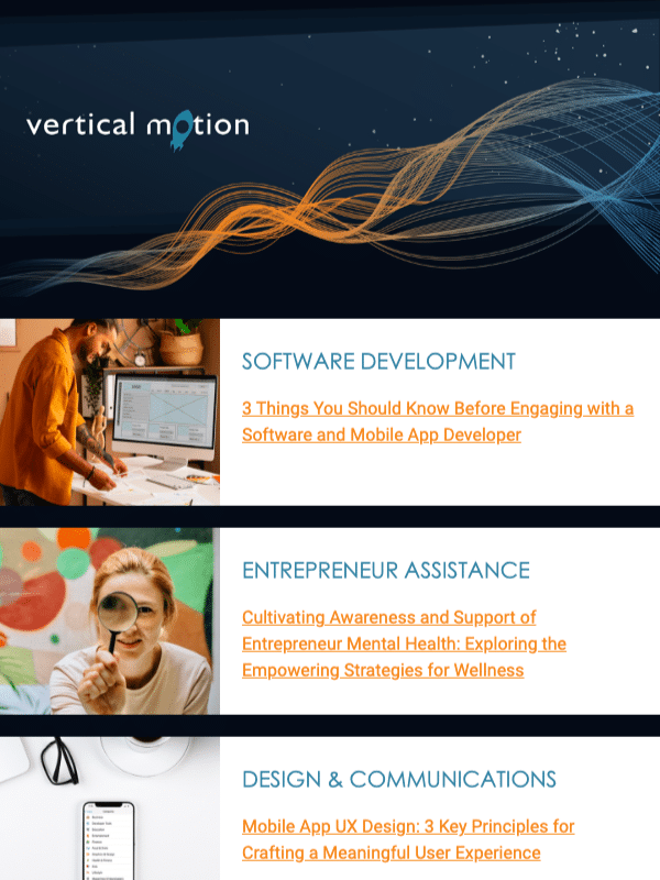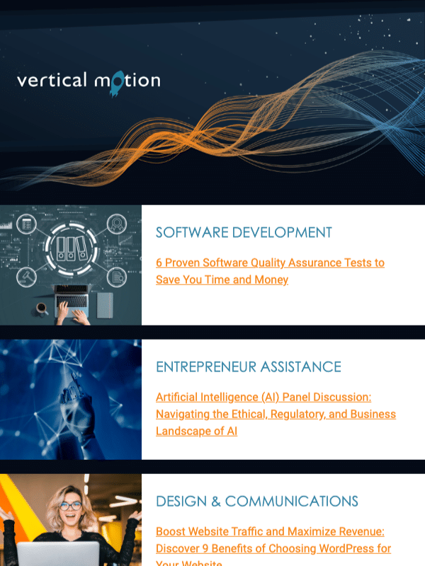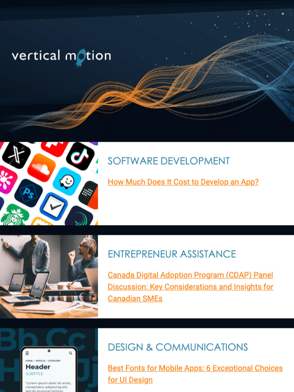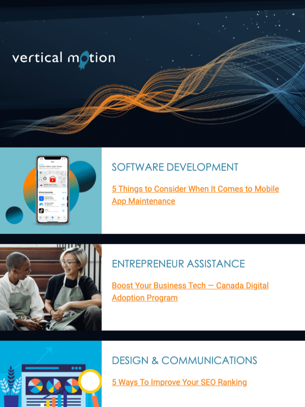 Whether you’re a longstanding client of ours, a business searching for a reliable Canadian software developer, or simply curious about Vertical Motion and what we do, our quarterly newsletter and periodic updates are a great way to stay informed.